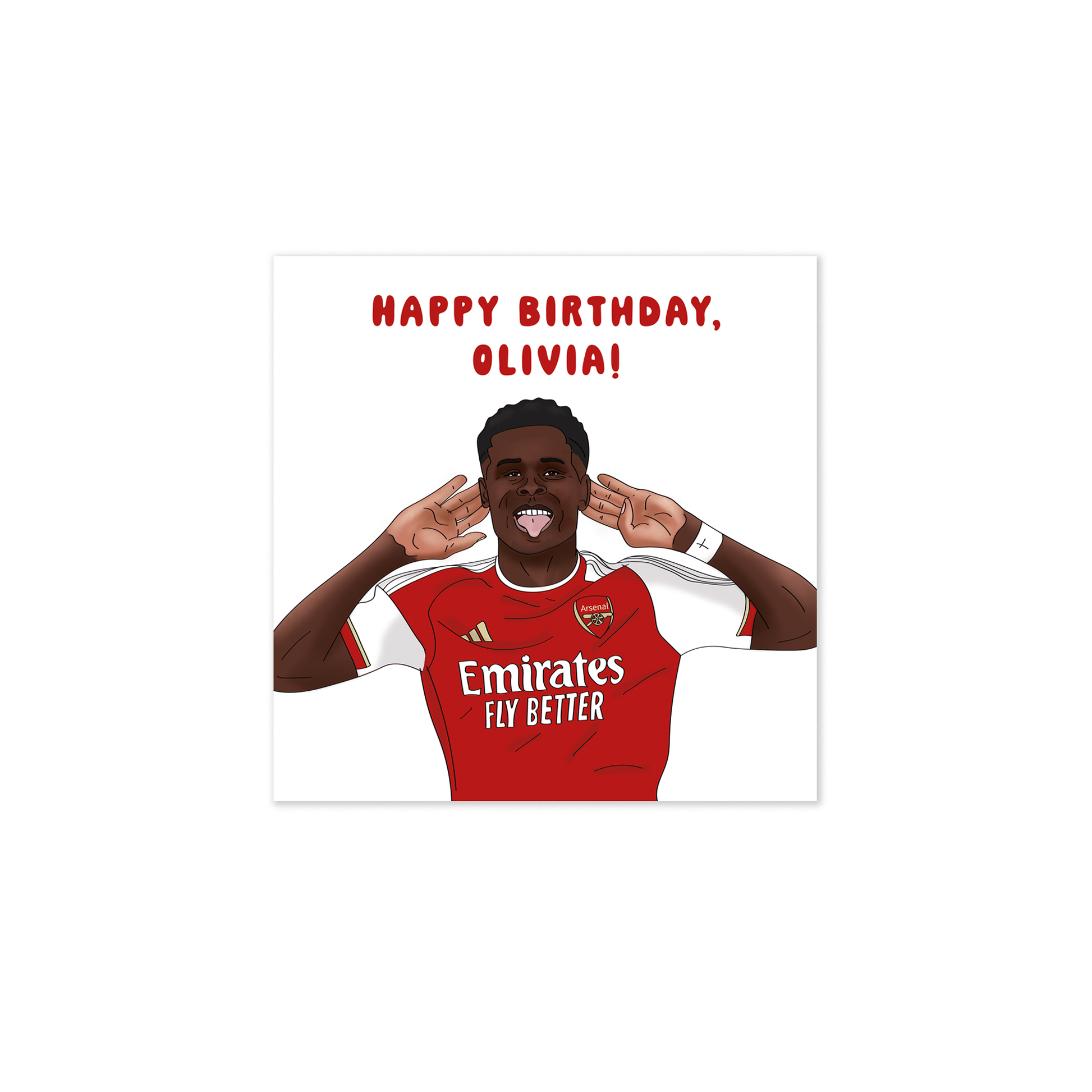 Celebrate the special day of any Arsenal fan with a Saka-inspired Birthday Card! This card is the perfect choice for football enthusiasts and Gunners supporters. Add a personal touch by including the recipient's name, making it truly unique and memorable. Each card is crafted with care, printed on high-quality 300gsm matte card.