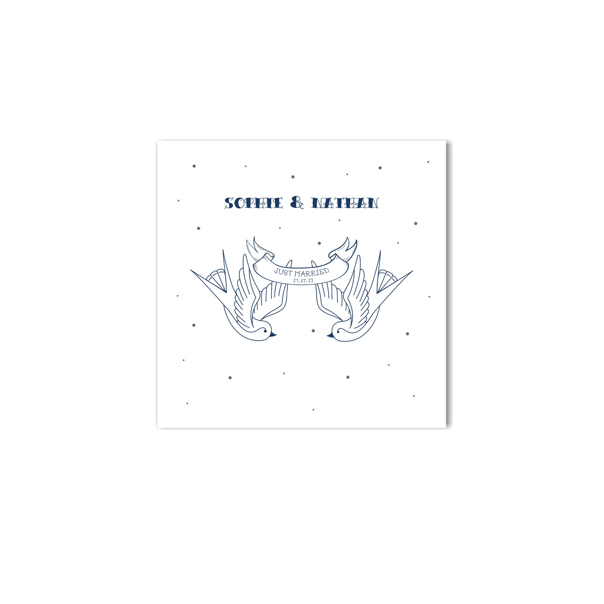 Honour their special day with a personalised swallow wedding or engagement card. Featuring the couple's names and an optional wedding date, this card adds a unique touch of elegance to their celebration. Each card is printed on premium 300gsm matte card, ensuring a sophisticated and high-quality finish.