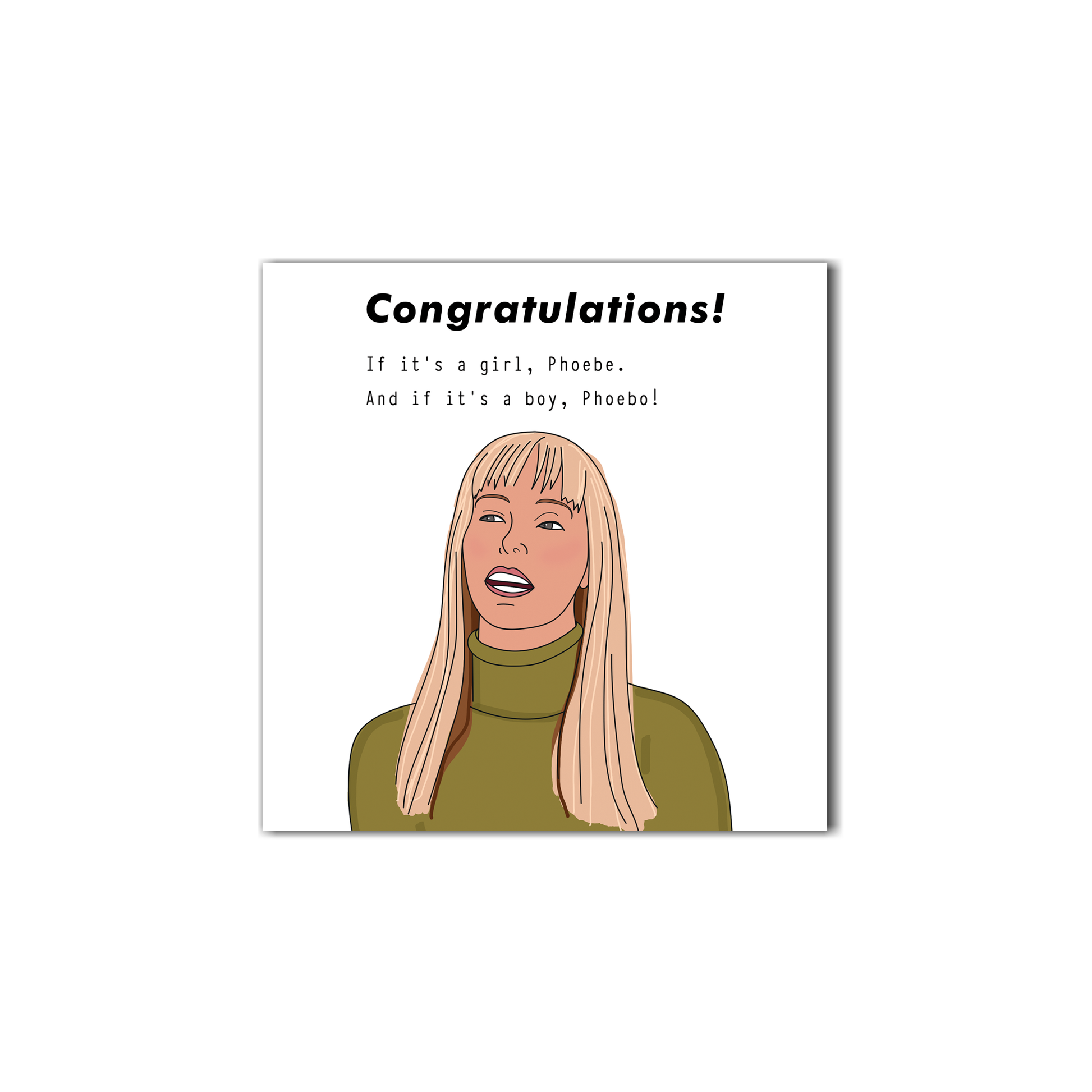 Phoebe or Phoebo New Baby Card, is a fun design to send congratulations to the new parents, on their new or upcoming arrival. This card is suitable as a baby boy card or a baby girl card, that adds a touch of nostalgia to someone's day, with this Phoebe Friends card - printed onto high quality 300gsm Invercote card.